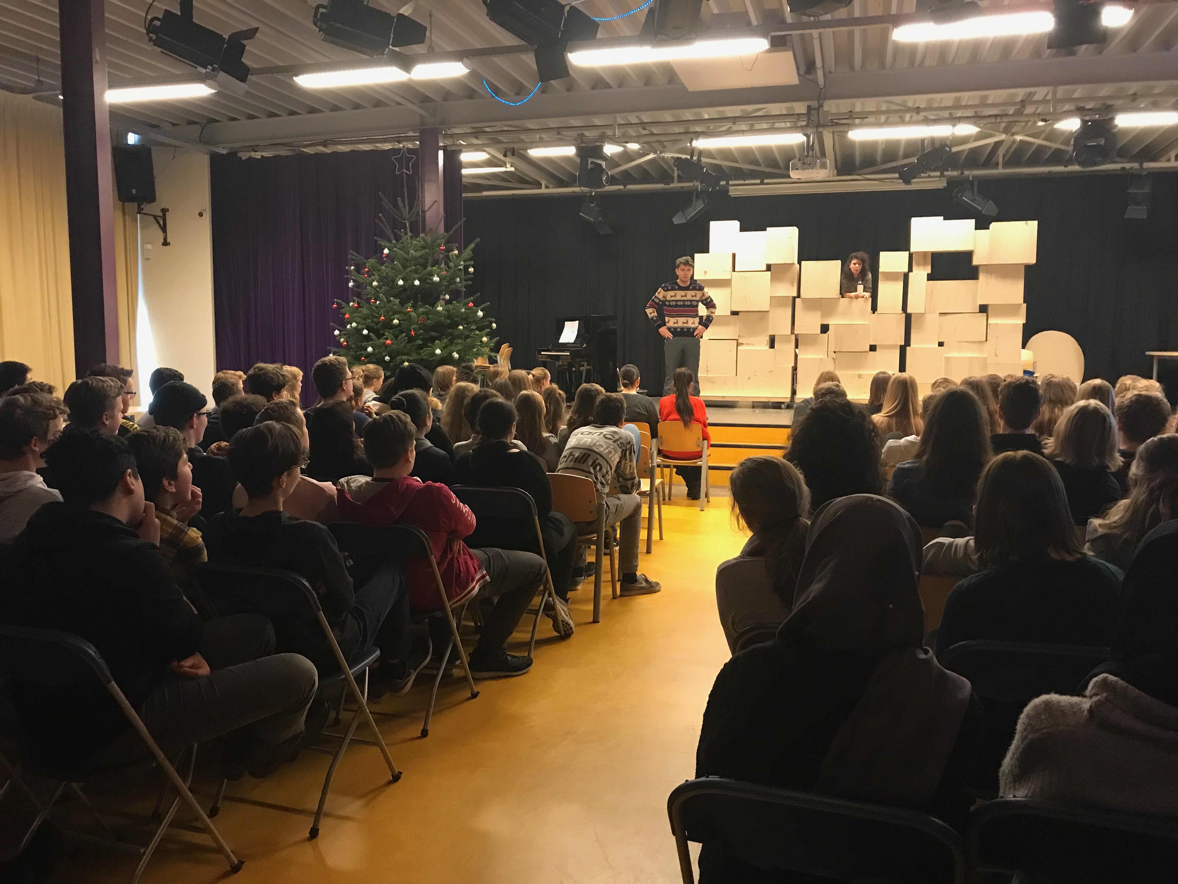 Onze voorstelling Dit is Mariken hebben we in een prachtig opgetuigde kerstaula gespeeld voor de leerlingen van het SGM van der Cappelen.