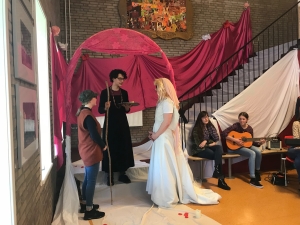 In het eerste onderdeel bereiden groepen van ongeveer 15-20 leerlingen in workshops op school allerlei optredens voor rondom de vijf historische teksten Mariken van Nieumeghen, Beatrijs, Karel ende Elegast, Reis van Sint Brandaan en Van de vos Reynaerde. Bij elke tekst hebben wij een aantal kunstopdrachten voorbereid die uitgevoerd worden door de leerlingen. Zij maken onder begeleiding van docenten op school en Hoosh Educatie korte performances en beeldend werk die allemaal te maken hebben met deze middeleeuwse teksten en met de middeleeuwen.